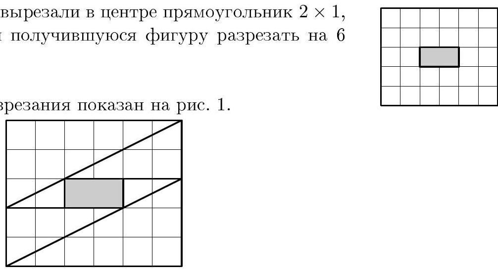 answer:We are given a rectangular grid with dimensions (6 times 5), from which a (2 times 1) rectangle is cut out from the center. We need to determine if this figure can be divided into 6 triangles. Let's consider the given dimensions and placement of the cut-out: 1. **Initial Figure:** - A (6 times 5) rectangle. The total number of unit squares in this initial rectangle is: [ 6 times 5 = 30 text{ unit squares} ] 2. **Subtracted Area:** - A (2 times 1) rectangle is cut out from the center. The area of this cut-out rectangle is: [ 2 times 1 = 2 text{ unit squares} ] 3. **Remaining Area:** - After the cut-out, the remaining area of the rectangle: [ 30 - 2 = 28 text{ unit squares} ] 4. **Dividing into Triangles:** - To determine if we can divide the remaining figure into 6 triangles, we need to visualize the problem or use a diagram similar to the one given in the reference image. From the reference image, we can see how a (6 times 5) rectangle with a (2 times 1) portion cut out can be split into 6 triangles. A helpful approach is to: - Divide the large rectangle into multiple smaller geometric shapes such that when rearranged or connected, they form 6 distinct triangles. - Ensure that each triangle adheres to the properties that their combined area indeed matches the remaining area of 28 unit squares. Now, we can draw some lines to visualize and achieve this specific division: 5. **Example Cutting Lines:** - One possible method of cutting (as per the reference diagram):  In this approach, we can see the figure can be divided along specific diagonal cuts into smaller triangles. We could verify: - Calculate the area of each triangle separately and ensure that the sum of these areas is equal to the total area of the original rectangle minus the cut-out section: Conduct this verification visually or geometrically. # Conclusion: Through visual representation and proper cutting, it is possible to divide the given (6 times 5) grid with the (2 times 1) cut-out in the center into 6 triangles. boxed{text{Yes, it is possible to divide the figure into 6 triangles.}}